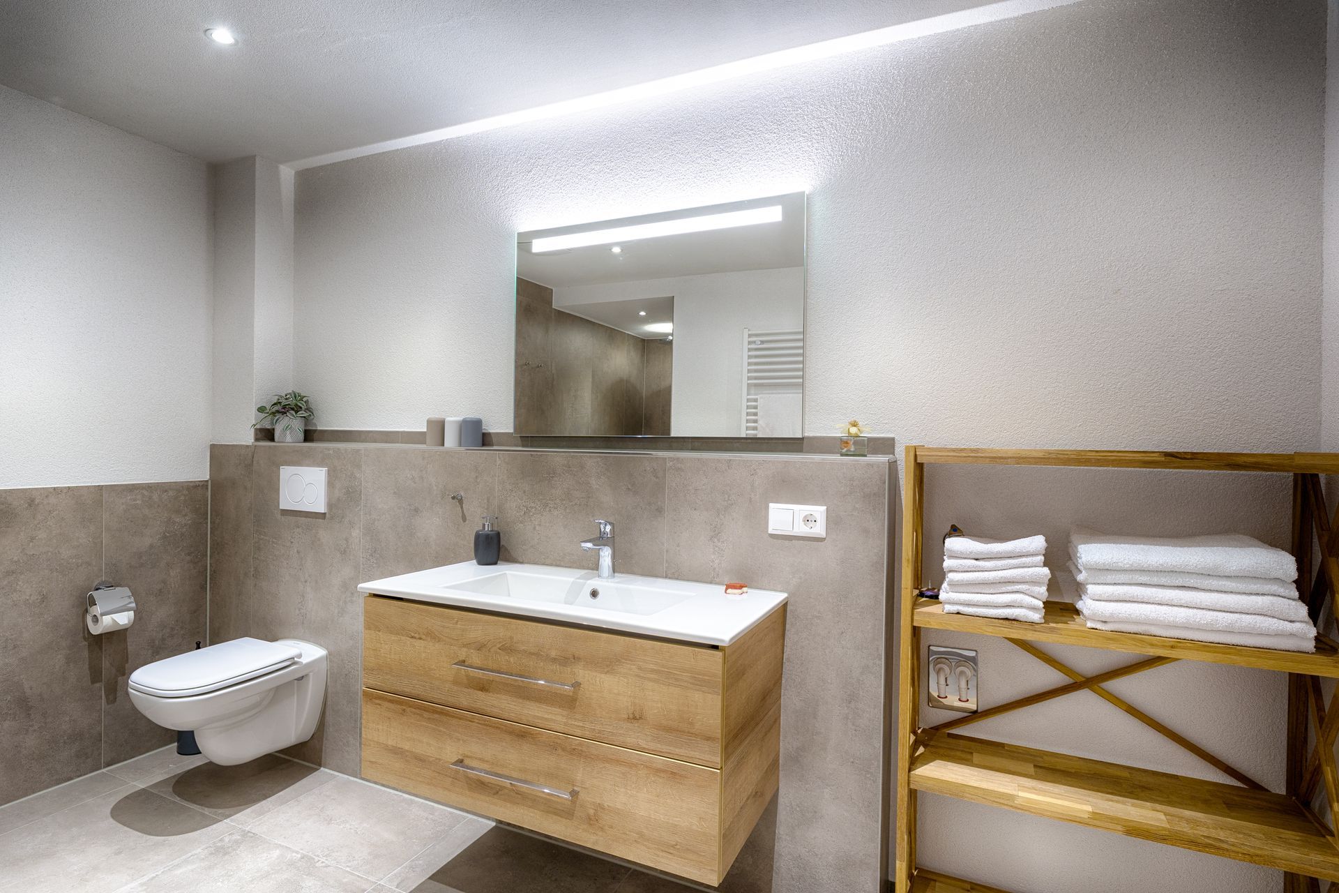 Neben einem Bad mit begehbarer Dusche und WC, gibt es ein kleines Gäste-WC.